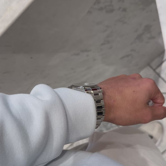 Housed in a polished stainless steel case and framed by a smooth bezel, this watch embraces clean lines and modern proportions. The polished Oyster bracelet offers a seamless blend of comfort and luxury, delivering a look that’s as suitable for everyday wear as it is for more formal occasions.