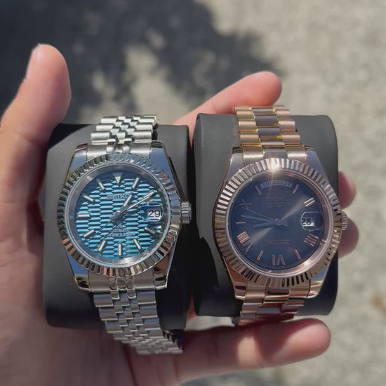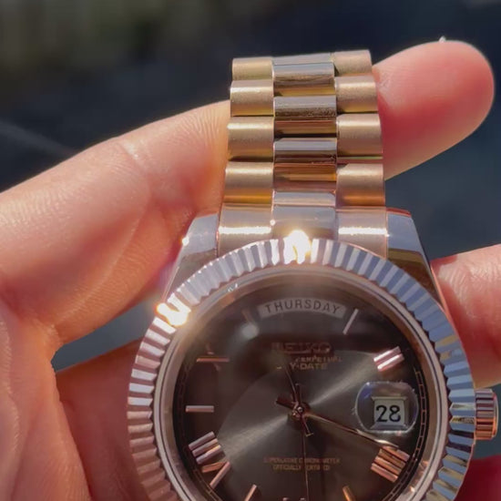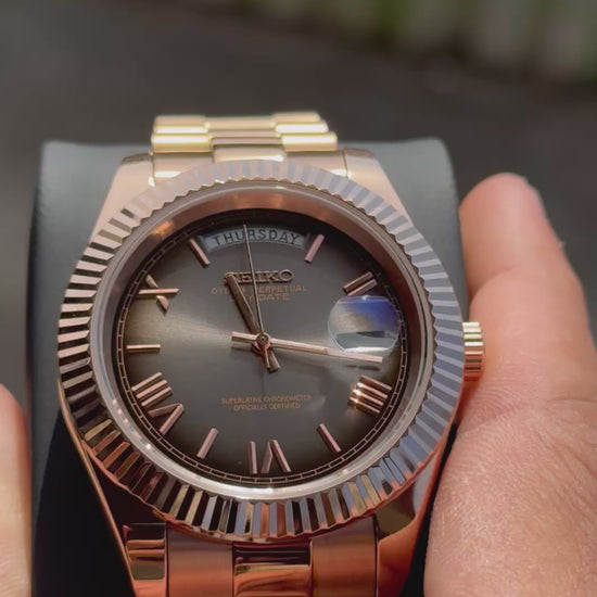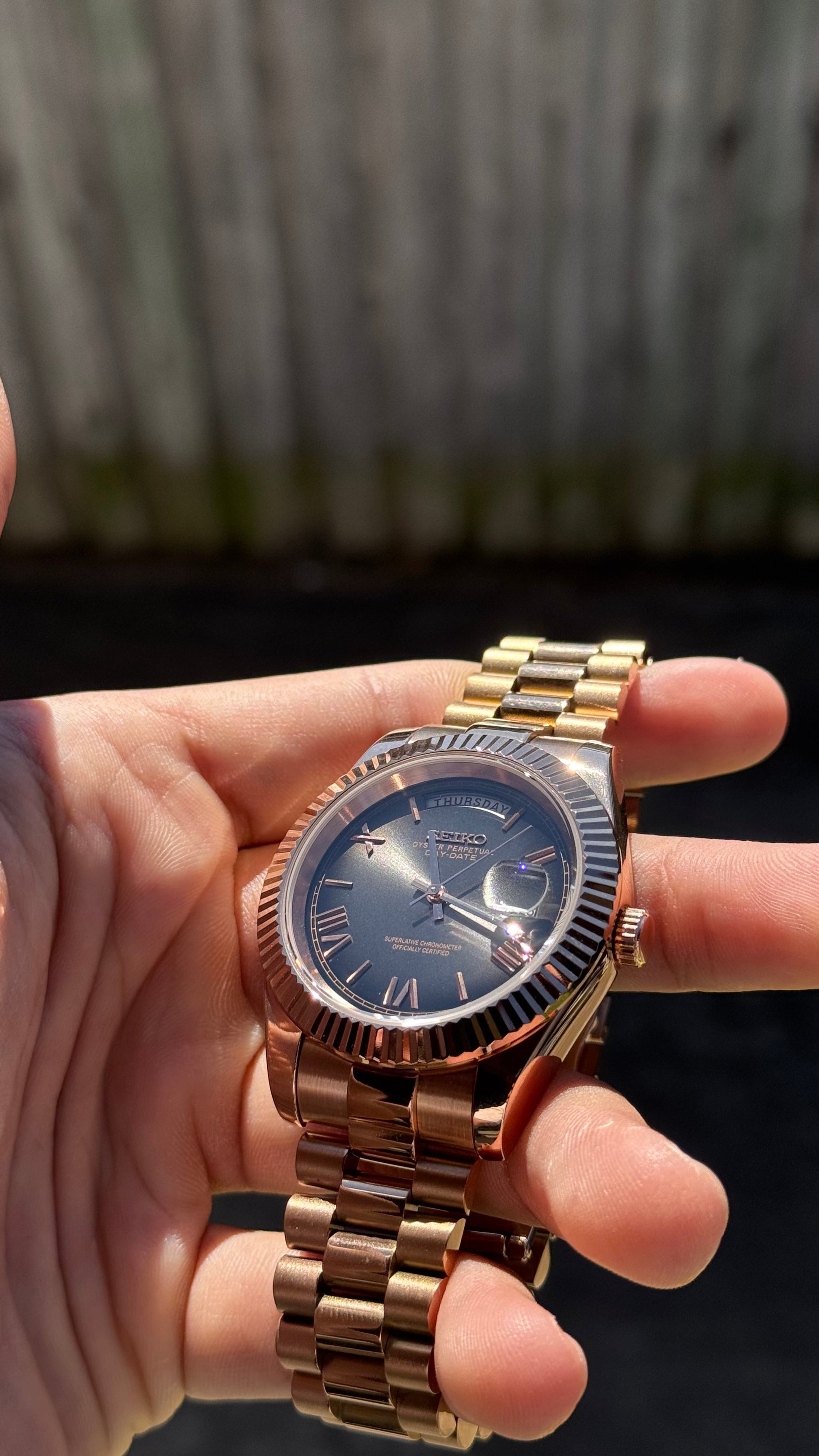 The Ombre Dial Perpetual Day Rose Gold, often called the Oscar Dial, is a striking timepiece that blends artistry with elegance. Its dial transitions seamlessly from a darker outer edge to a lighter centre, creating a captivating ombre effect that shifts with the light. The rose gold case and bracelet enhance this effect beautifully, adding warmth and luxury to the overall design.