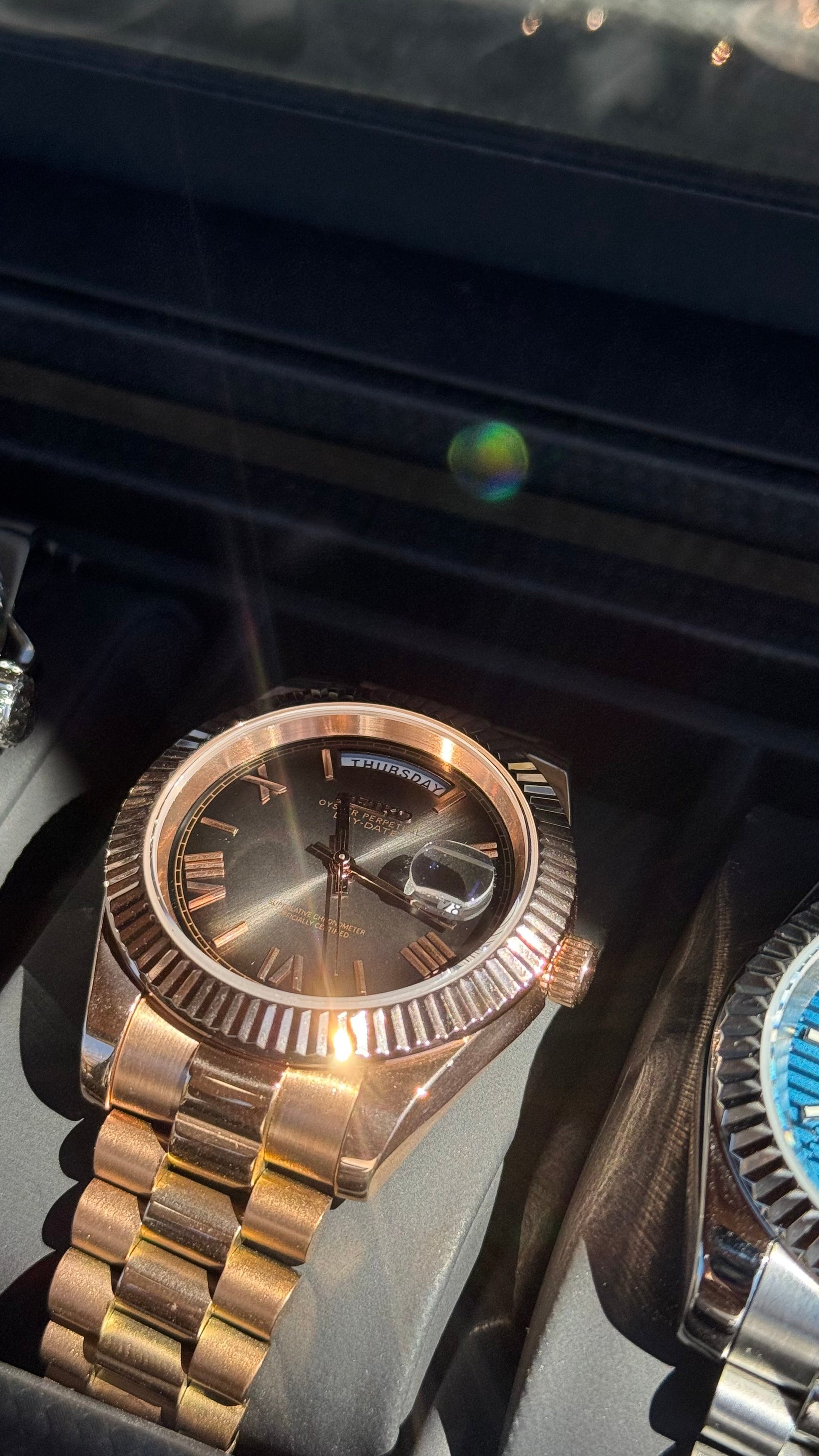 With the classic Perpetual Day configuration, offering both day and date functionality, this watch combines everyday practicality with refined style. The contrast of the ombre dial against the polished rose gold makes it a bold yet versatile piece, perfect for those who want their watch to stand out while remaining timeless.