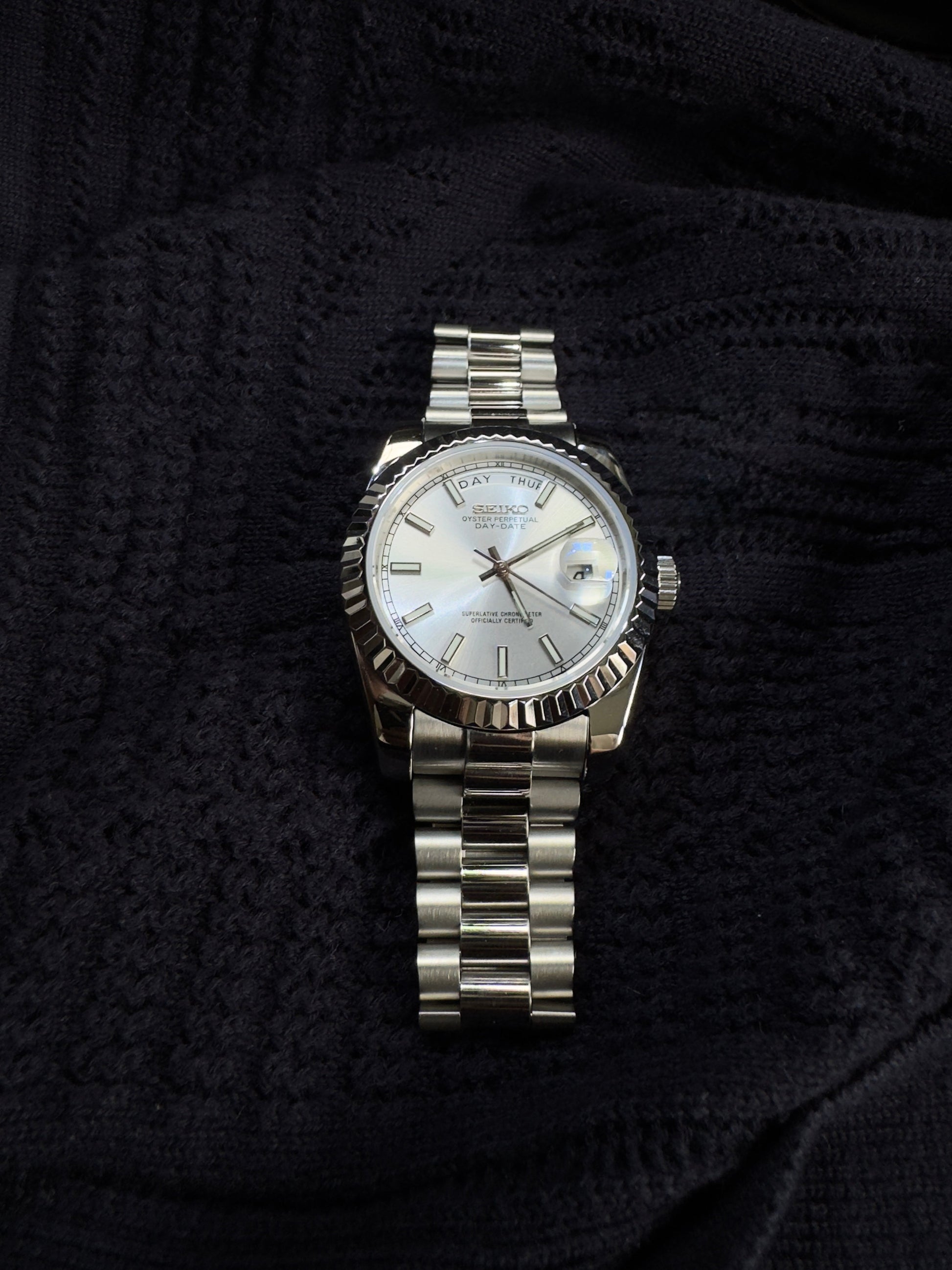 The Snow White Perpetual Day is clean, elegant and versatile. Its crisp white dial creates a refined backdrop for luminous markers and hands, with the day-date display adding functionality. Encased in stainless steel, this watch balances durability with understated elegance. A timeless piece that fits any occasion.